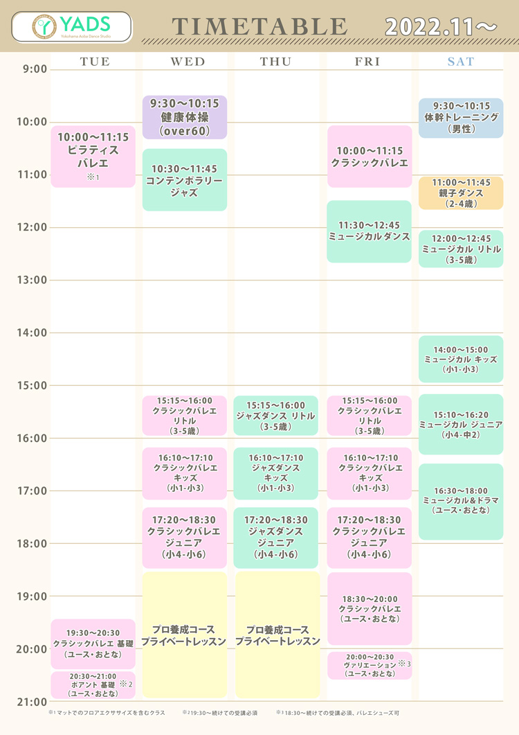 EVENT 最新のタイムテーブルをご案内いたします。 横浜青葉ダンススタジオ YADS(Yokohama Aoba Dance Studio)のホームページをご覧いただきまして、ありがとうございます。 最新のタイムテーブルをご案内いたします。 どうぞご覧ください。 クリックするとPDFが開きます。 ご予約・お問い合わせ・体験レッスンのお申し込みはこちら